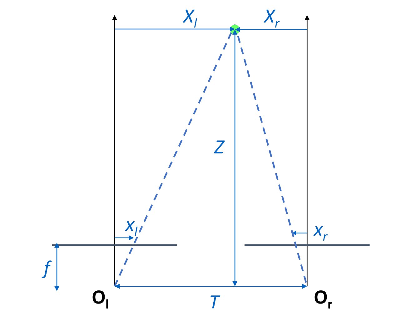 我们考虑相机之间距离为 T. 且为针孔相机,焦距为 f,物体距离相机的深度为 Z. 以下的向量中 Xl,xl>0 表示在轴的右侧,Xr,xr>0 表示在轴的左侧
