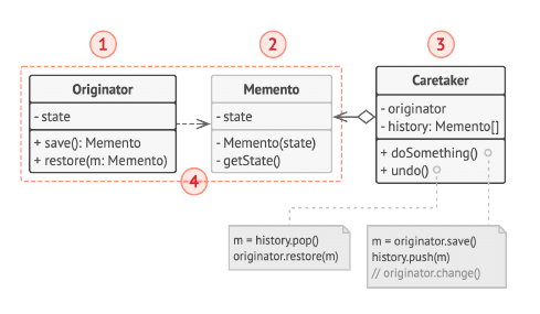 所以解决办法是,让 Object 来生成自己的 snapshot,这样就不会有外部 class 来访问自己的私有数据了.并且,除了 Object 自己,没有其他对象可以直接访问其 snapshots,而是必须通过给定的 interface,这样确保了不会暴露实现细节.在此基础之上,snapshots 可以被保存在 Caretakers 的对象中,由于限制策略,Caretakers 也无法直接访问 snapshots 的内部状态,但是可以通过 interface 与之互动.(例如,这里的 Caretakers 可以是负责 snapshot history 的类)